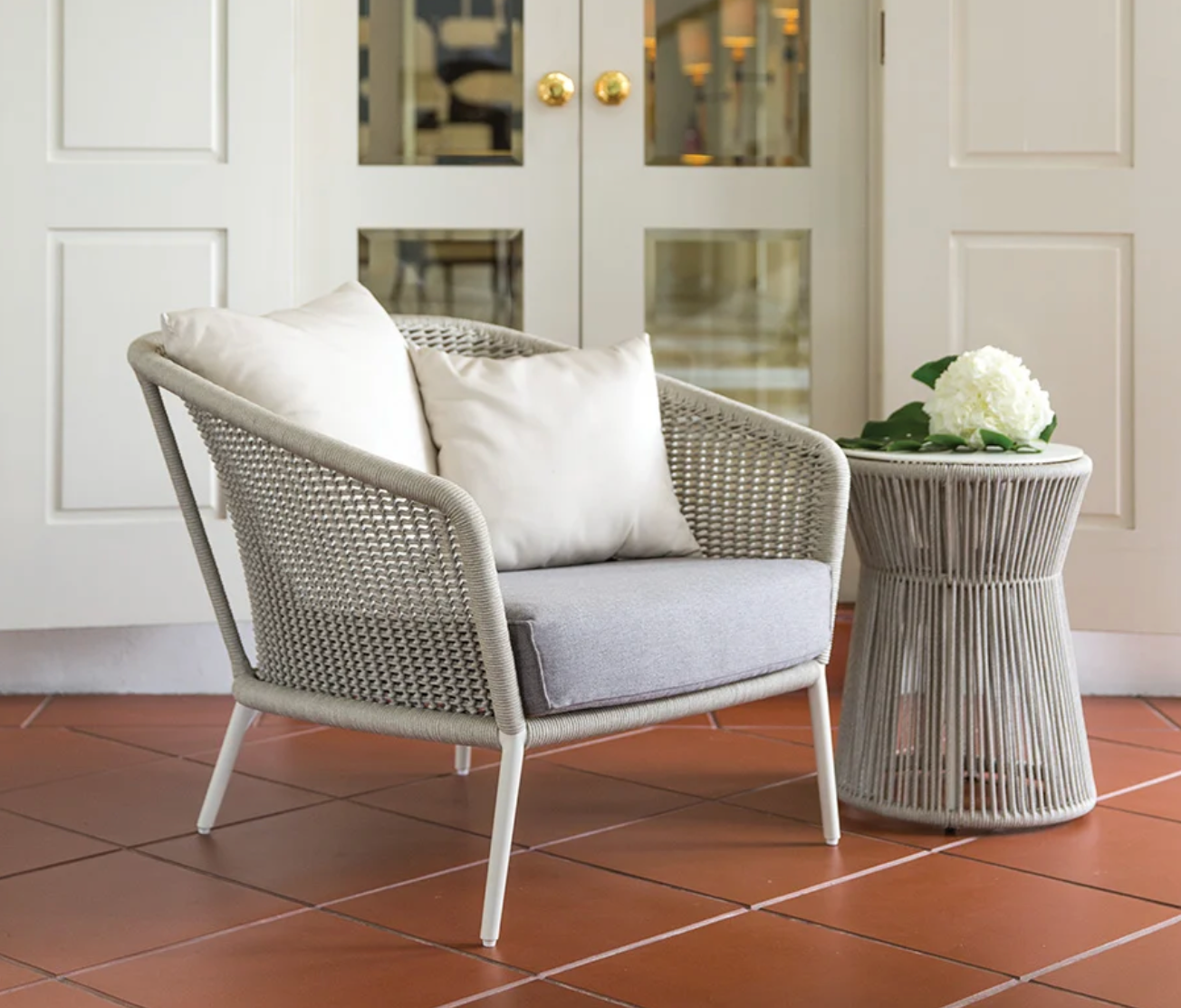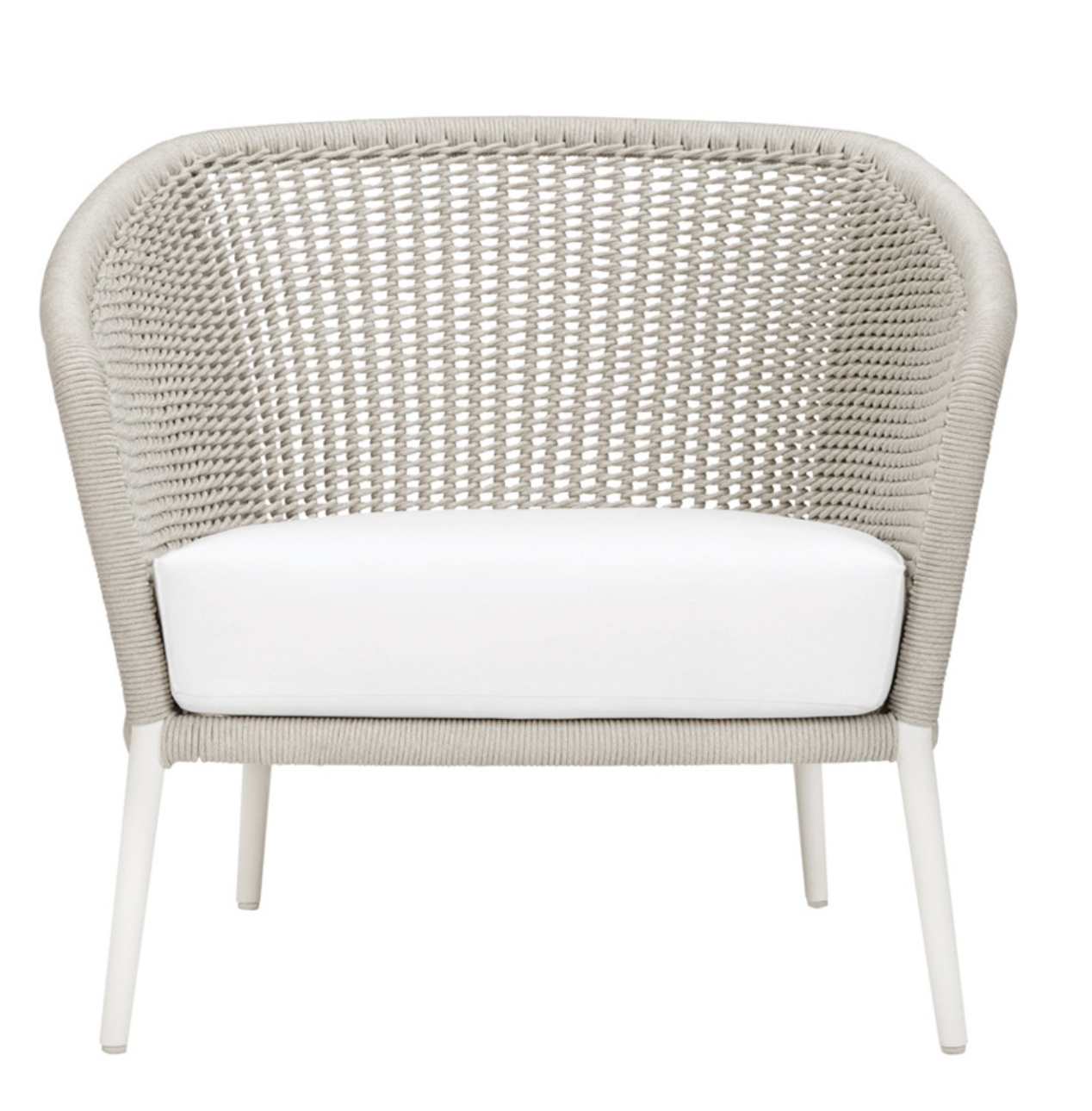 Frame: Aluminum with JANUScoat™. Seat: Olefin Straps. Back: Handwoven Olefin Rope. 304 Stainless Steel Hardware. Cushions required and sold separately.